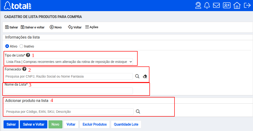 Ao clicar no submódulo Lista, será necessário preencher as seguintes informações: