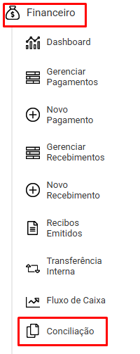 Primeiro acesse Financeiro > Conciliação.