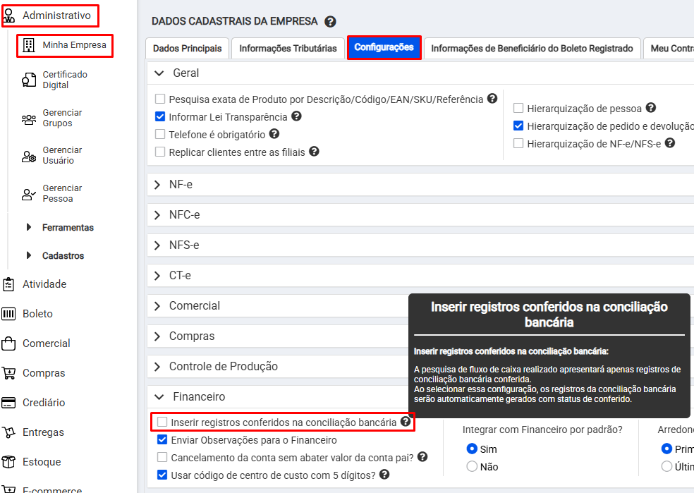 Você pode remover a conciliação automática nos parâmetros cadastrais da empresa em Administrativo > Minha Empresa > Configurações Financeiro