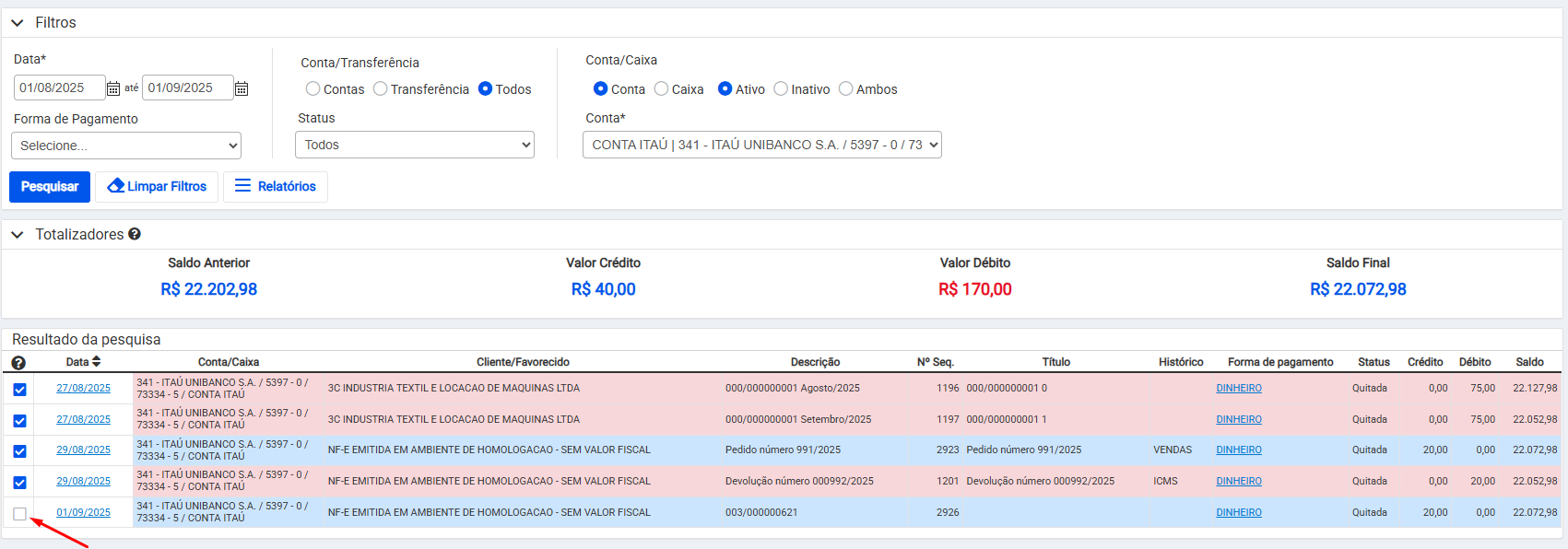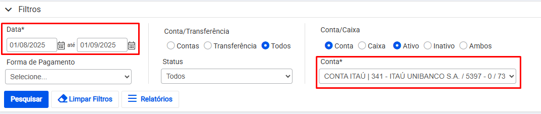 Em seguida pesquise pelo banco vinculado ao seu lançamento e a data de movimentação dessa operação