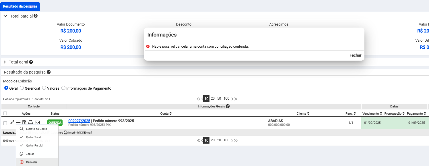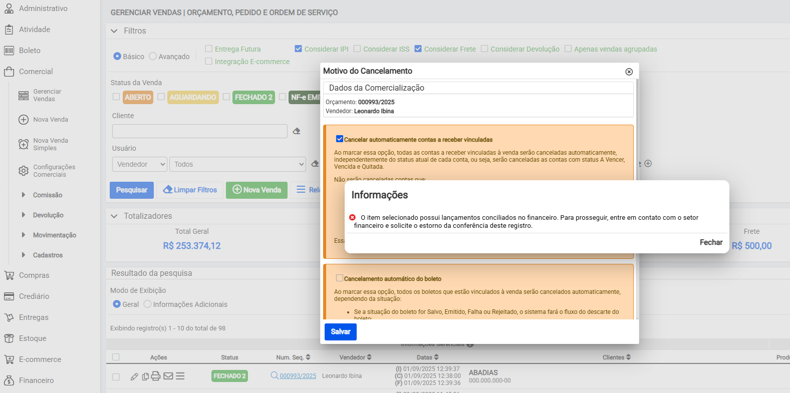 Feito isso já será possível realizar o cancelamento da sua venda, nota fiscal ou o próprio lançamento financeiro.