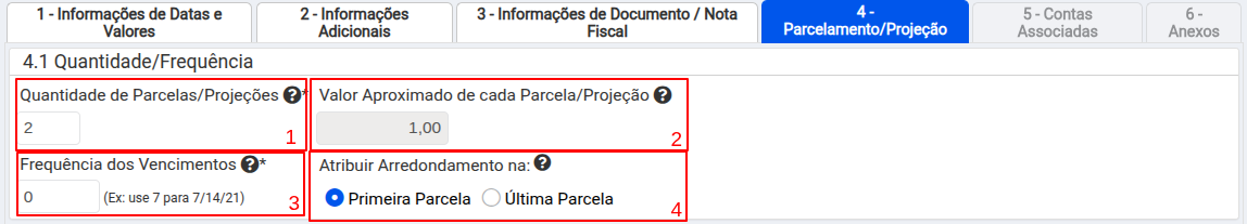 Ao selecionar uma conta como Parcelamento ou Projeção, o sistema vai habilitar a Aba Parcelamento/Projeção. No item Quantidade/Frequência, será necessário preencher as seguinte informações: