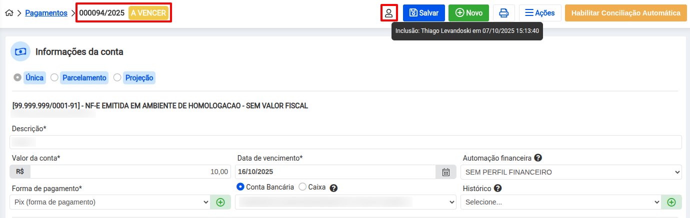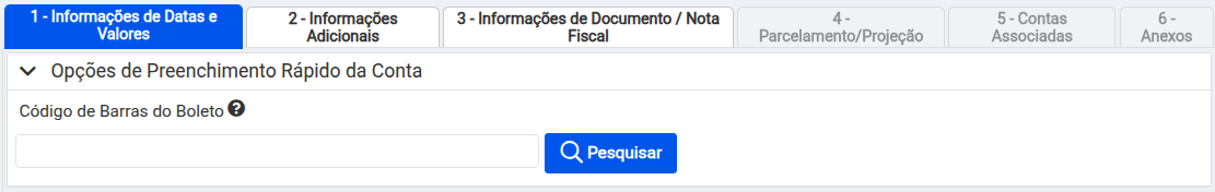 1 - Título / Documento: Neste campo é possível inserir o número referente a algum documento ou título relacionado a conta, por exemplo, número de boleto registrado, contrato, etc.