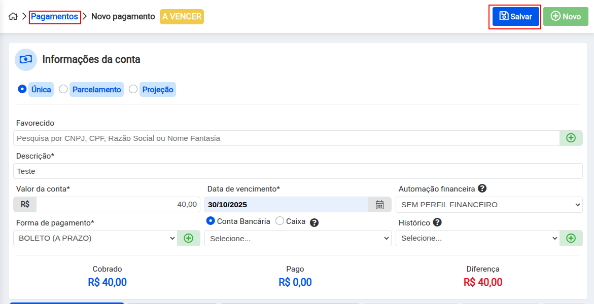 No topo da tela do Novo Pagamento, a primeira coisa que é necessário informar é se a conta é única, parcelamento ou uma projeção. A função de cada uma é: