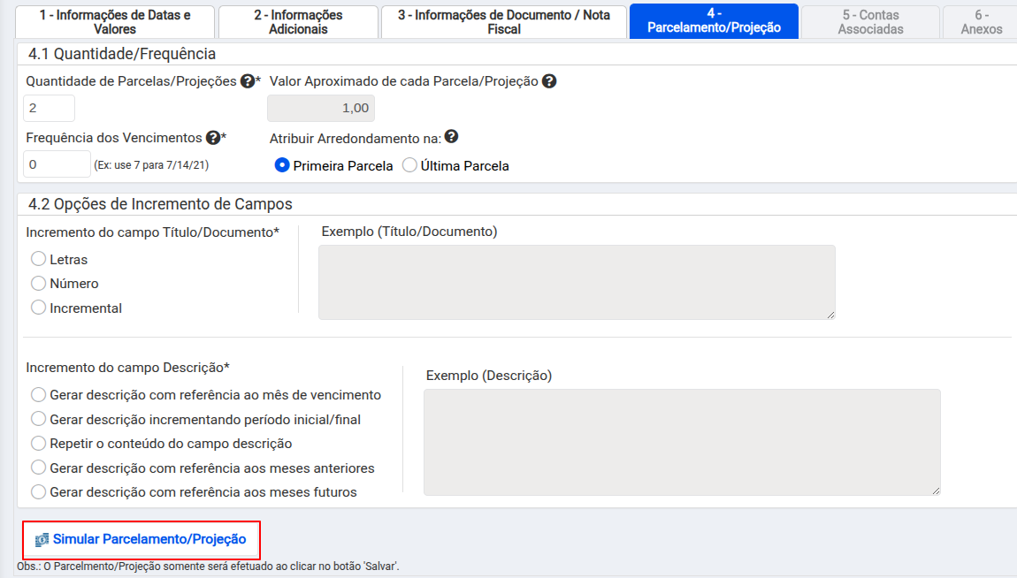 1 - Quantidade de Parcelas/Projeções: Neste campo será necessário informar a quantidade de repetições (projeções).