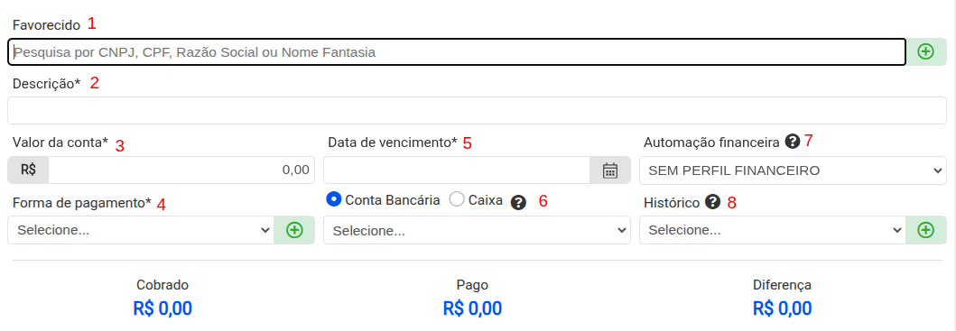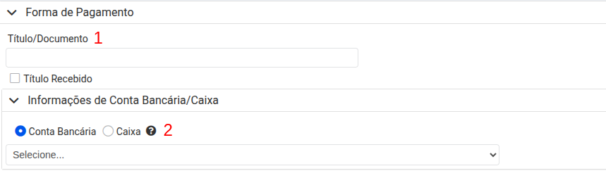 Observação: Esse campo não é de preenchimento obrigatório, porém é recomendado selecionar uma conta bancária ou caixa para gerar relatórios com as informações, e para facilitar na quitação de sua conta. O campo também atualiza assim que você preenche o campo "Conta Bancária/Caixa" anteriormente na página.
