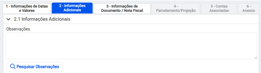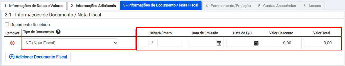 2 - Adicionar Documento Fiscal: Ao clicar neste botão será possível inserir as informações de algum documento relacionado a essa conta.