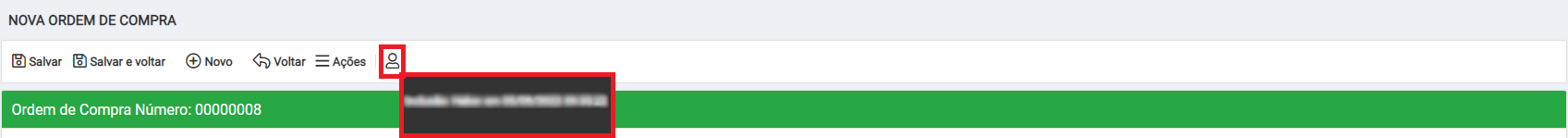 No ícone é possível visualizar o nome do usuário, data e horário da inclusão desta ordem de compra.