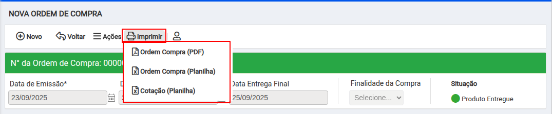 Do lado do botão de ações, há o botão de Imprimir, onde você poderá escolher as seguintes opções: