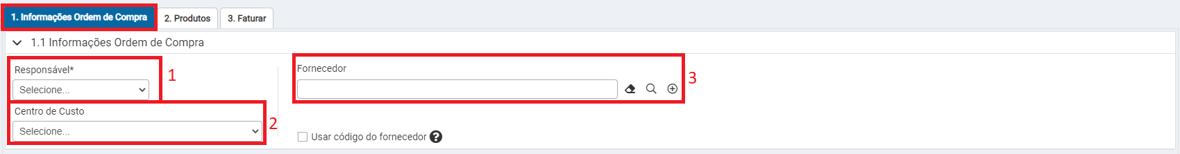 1 - Responsável: Neste campo é necessário selecionar o usuário responsável que está gerando essa ordem de compra.