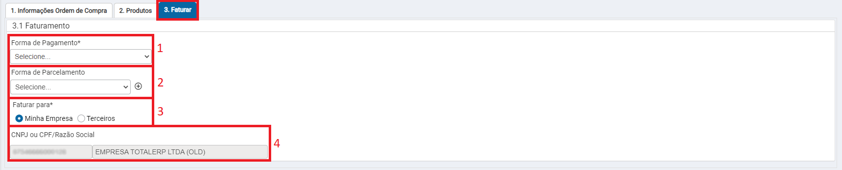 3 - Faturar para: Neste campo é necessário selecionar se a compra será faturada para Minha empresa (no caso sua empresa) ou Terceiros.