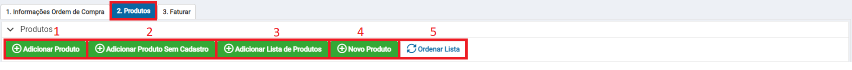 1 - Adicionar Produto: Ao clicar neste botão é possível realizar a pesquisa de produtos já cadastrados no sistema.