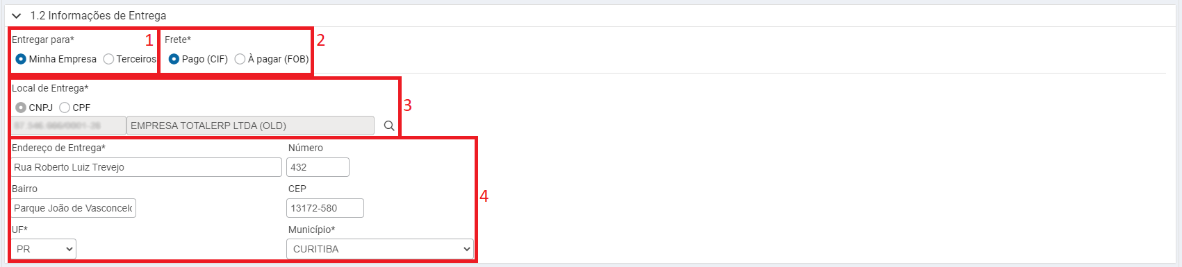 4 - Endereço de Entrega / Número / Bairro / CEP / UF / Município: Nestes campos será apresentado o endereço da sua empresa ou da pessoa/empresa terceiro, conforme o que foi selecionado nos campos anteriores.