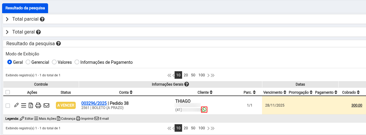 Pesquise e localize o recebimento (cobrança) que deseja enviar.