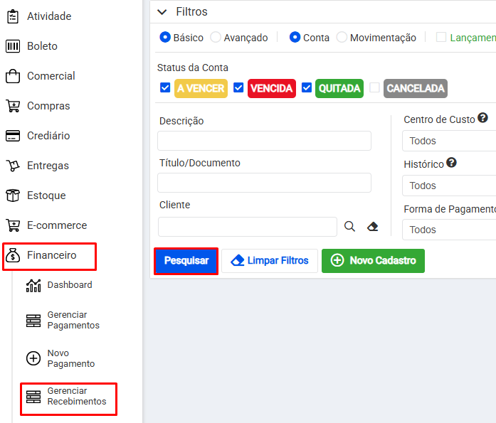 Para verificar as contas criadas, acesse o módulo Financeiro > Gerenciar Recebimentos > Pesquise pelas contas geradas a partir da venda.