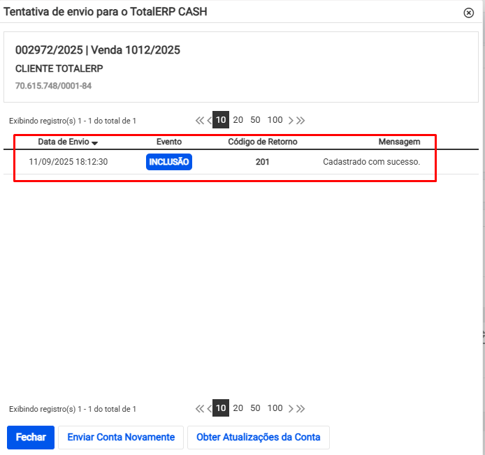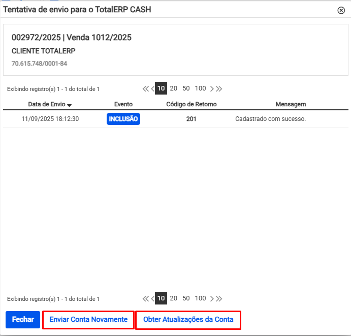 Caso tenha ocorrido alguma falha de comunicação, é possível reenviar essa conta para a fila de cobranças usando o botão Enviar Conta Novamente ou verificar se há alguma atualização de status como o pagamento do cliente no botão Obter Atualizações da Conta.