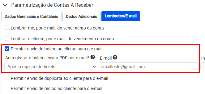 OBSERVAÇÃO: Na aba Lembretes/E-mail, marque a opção Permitir envio de boleto ao cliente para o