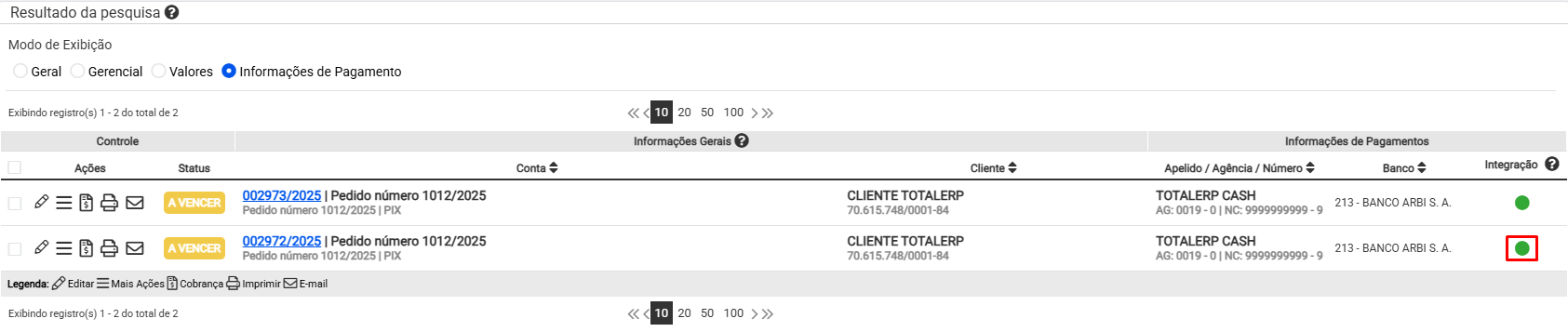 Altere o Modo de Exibição para Informações de Pagamento e clique no botão de Integração ao final da coluna.