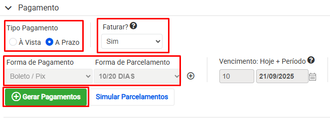 Mais abaixo, no painel de Pagamento, vamos marcar o tipo de pagamento com a mesma opção cadas trada na forma de pagamento, por exemplo, pagamento A Prazo.