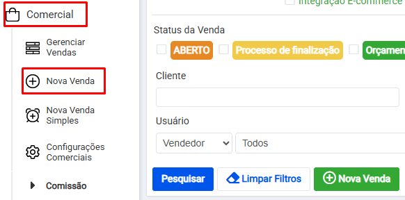 Para iniciar uma nova venda, acesse o módulo Comercial > Nova Venda.