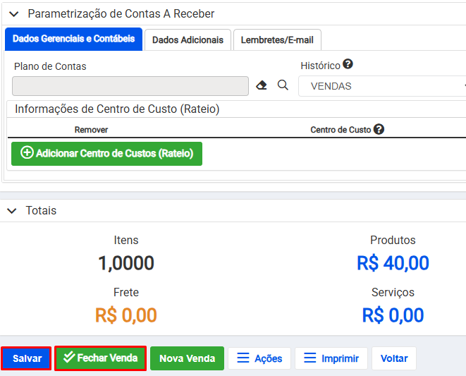 Por fim, podemos clicar em Salvar e na sequência Fechar Venda.