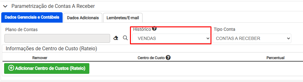 Na aba Integração Financeira, selecione um perfil financeiro cadastrado, com a configuração de lembretes