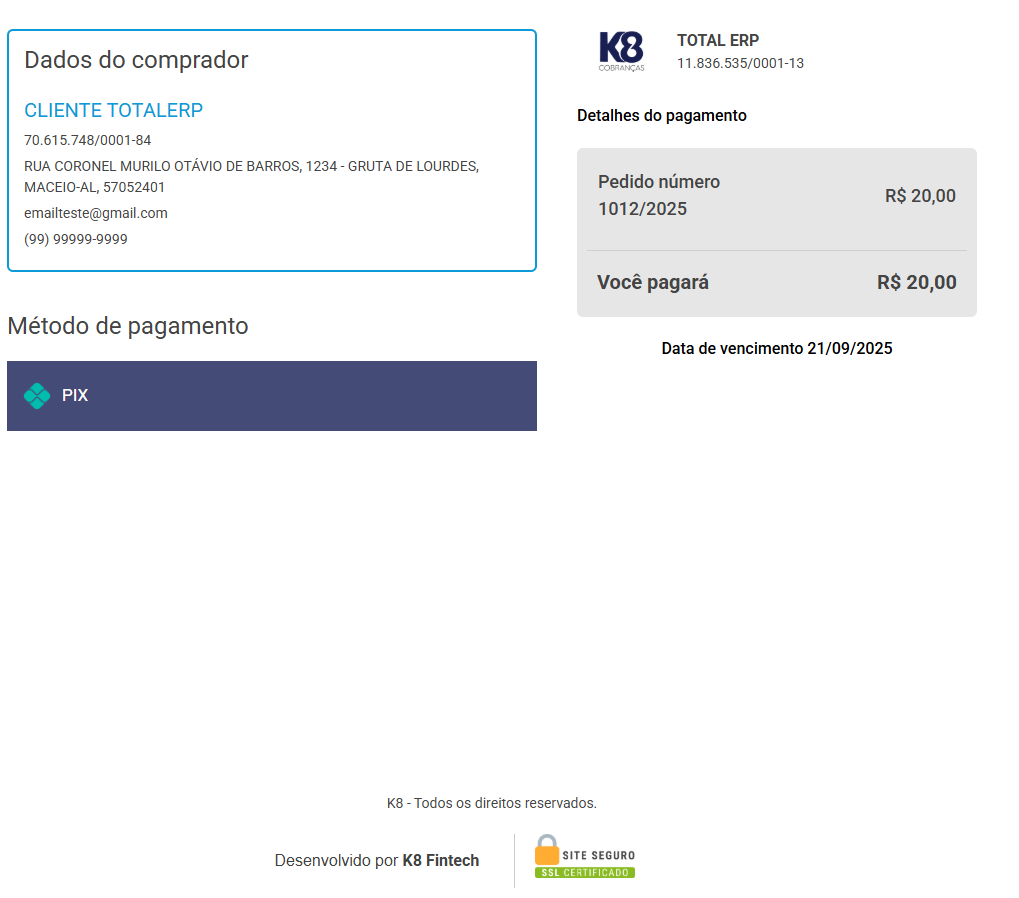 O TotalERP irá abrir uma nova aba em seu navegador com a tela de cobrança que será enviada ao cliente.