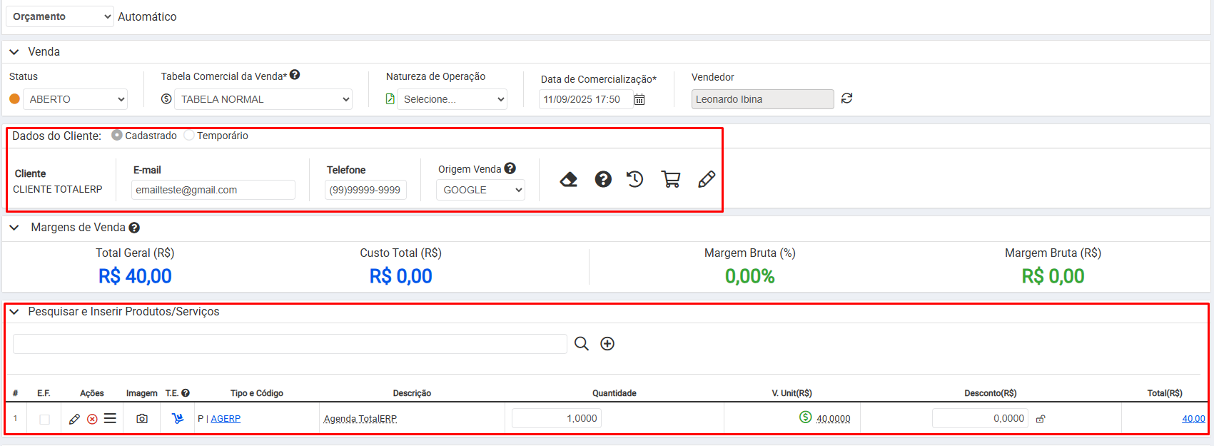 Para inclusão da venda, inclua um cliente e os produtos vendidos, caso deseje ver o preenchimento da ven