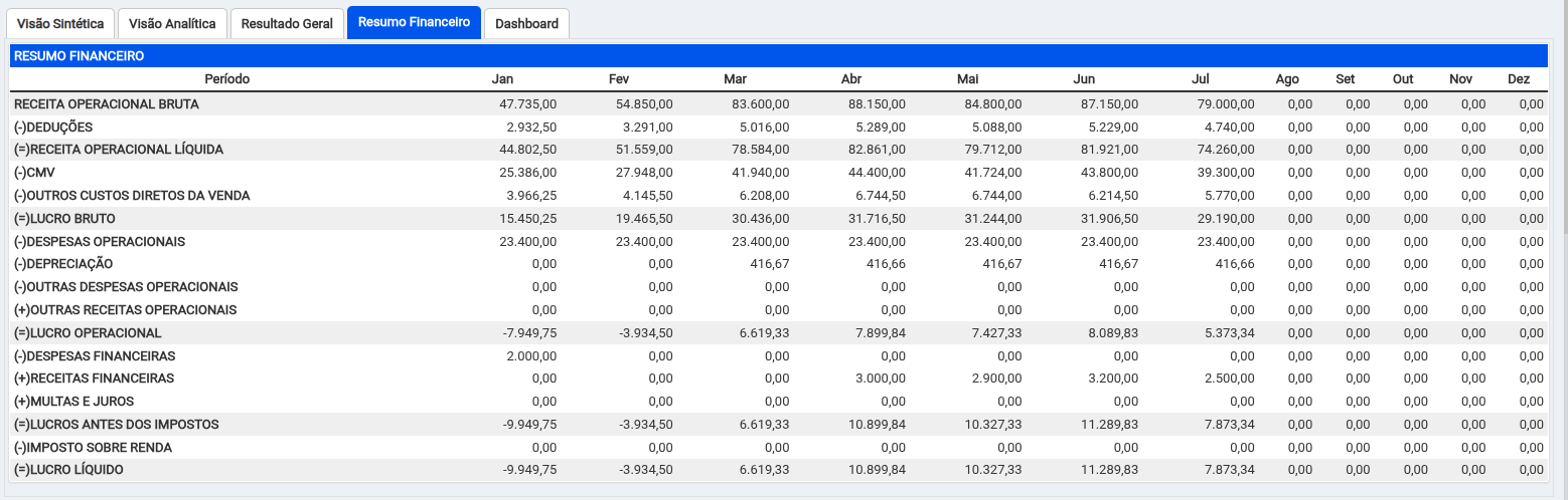 Lucro Líquido: resultado final da empresa dos Lucros Antes dos Impostos menos os valores do Imposto Sobre Renda. Ele representa o valor final mensal de sua empresa para identificar se naquele período houve lucro ou prejuízo.