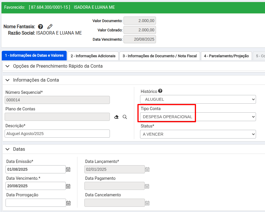 Com o Tipo de Conta e a Classificação de Competência parametrizados, podemos informá-los nos pagamentos e recebimentos. Ao lançar uma conta a pagar ou a receber, é possível informar o tipo de conta a partir do perfil de automação financeira selecionado ou preenchendo esse campo dentro das contas.
