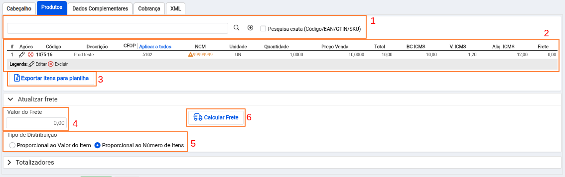 6 – Calcular Frete: Ao preencher os campos citados anteriormente, é necessário clicar no botão Calcular Frete para que o sistema realize a distribuição do valor entre os produtos.