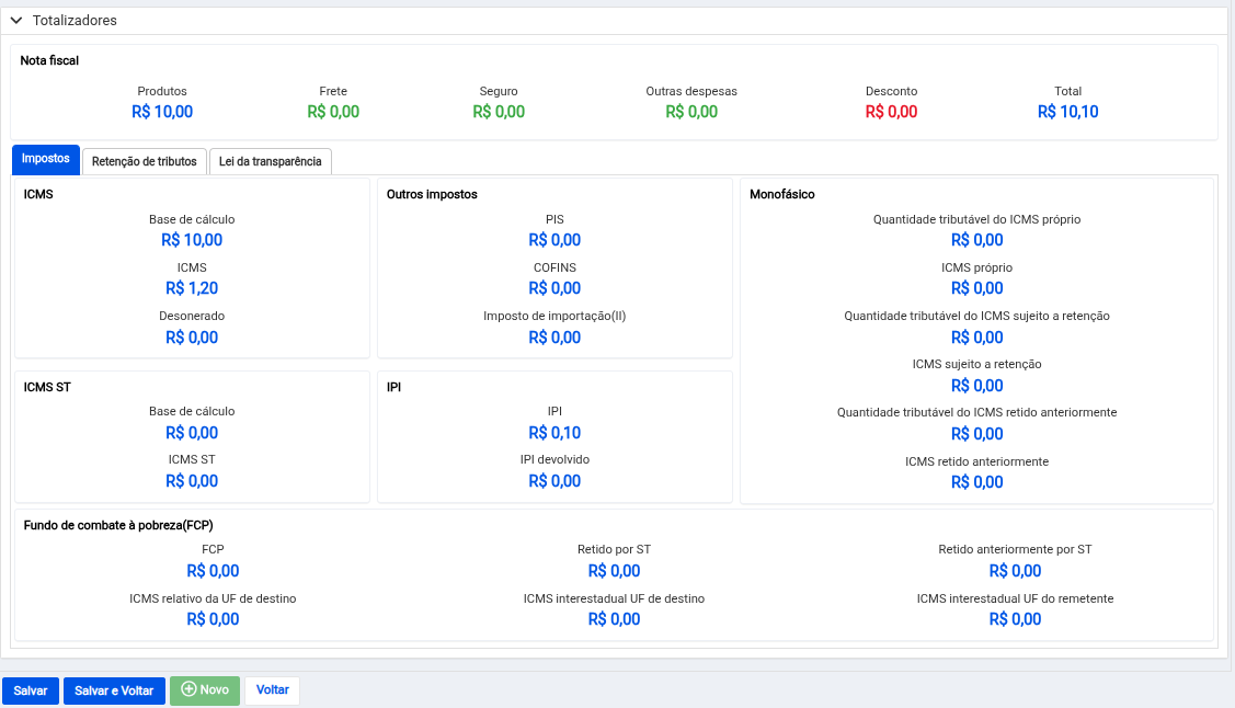 No item Totais, é apresentado o total final de acordo com os produtos que estão na NF-e, dessa forma é possível validar se o que está sendo informado de tributação nos produtos está correta.