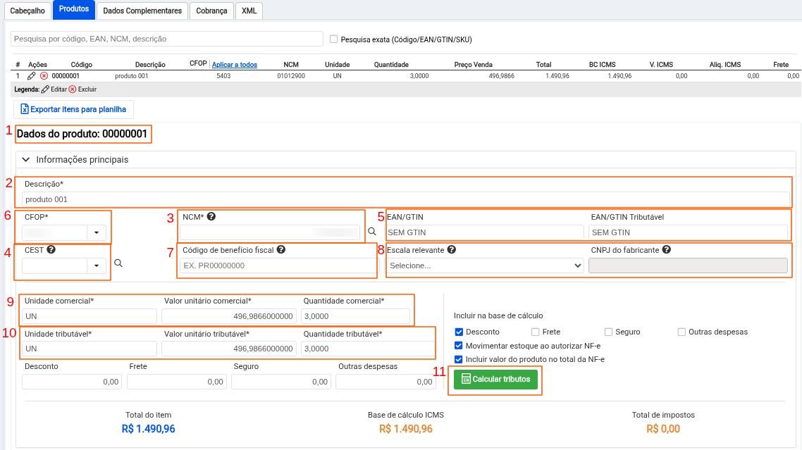 1 – Produto: Nesse campo, realize a pesquisa de mais produtos para inserir na NF-e.