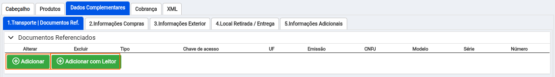 Na aba 1. Transporte | Documentos Ref. e no item Documentos Referenciados, é possível inserir a chave de acesso da NF-e que originou a entrada dos produtos (se houver). Existem dois botões para realizar a inserção, são eles: