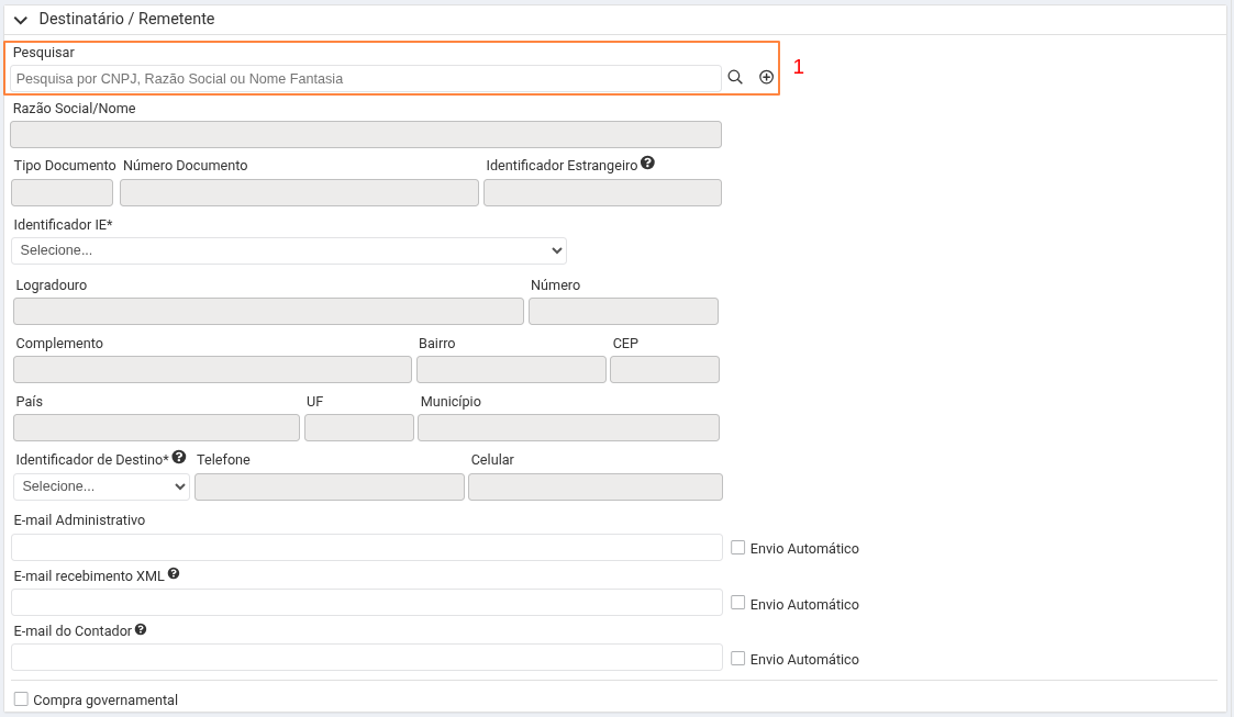 Ainda na aba Cabeçalho, um pouco mais abaixo é apresentado o item Destinatário / Remetente, nesse item é necessário inserir as informações do destinatário da NF-e.