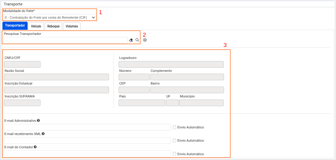 Ainda na aba 1. Transporte | Documentos Ref. e no item Transporte, é possível inserir informações sobre o transportador e volumes. Abaixo descrevemos cada campo.