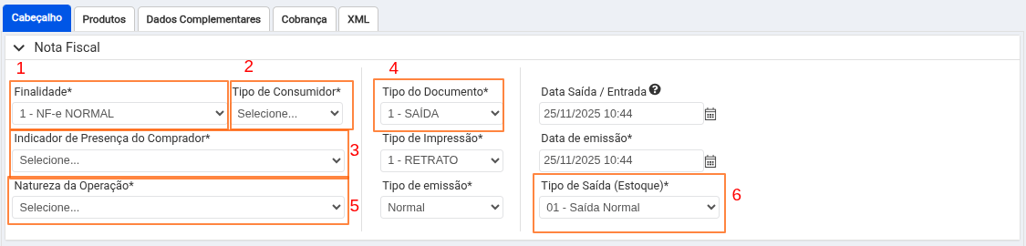 6 – CFOP: Código Fiscal de Operações e de Prestações das Entradas de Mercadorias e de Bens e da Aquisição de Serviços (CFOP), é um código de 4 dígitos controlado pelo Governo Federal, esse código tem como objetivo de definir qual é a operação que será realizada com essa NF-e. Recomendamos que entre em contato com sua assessoria contábil para identificar qual é o CFOP correto para sua operação.