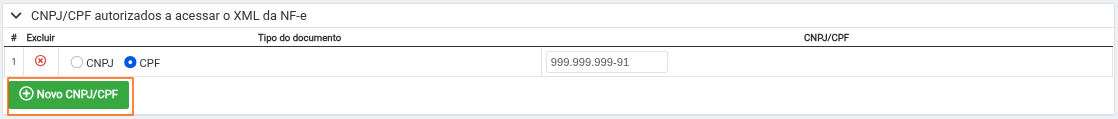 Ainda na aba 1. Transporte | Documentos Ref. e no item CNPJ/CPF autorizados a acessar o XML da NF-e, é possível inserir o CNPJ ou CPF que terá autorização para realizar o download do XML no portal do SEFAZ. Caso tenha necessidade, clique no botão Novo CNPJ/CPF.