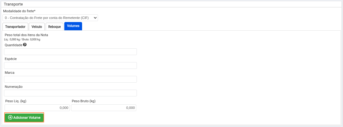 Ainda no item Transporte e na aba Volume, é possível inserir informações sobre o peso das mercadorias transportadas.