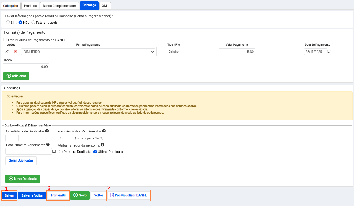 1 – Quantidade de duplicatas: Informe a quantidade de parcelas.