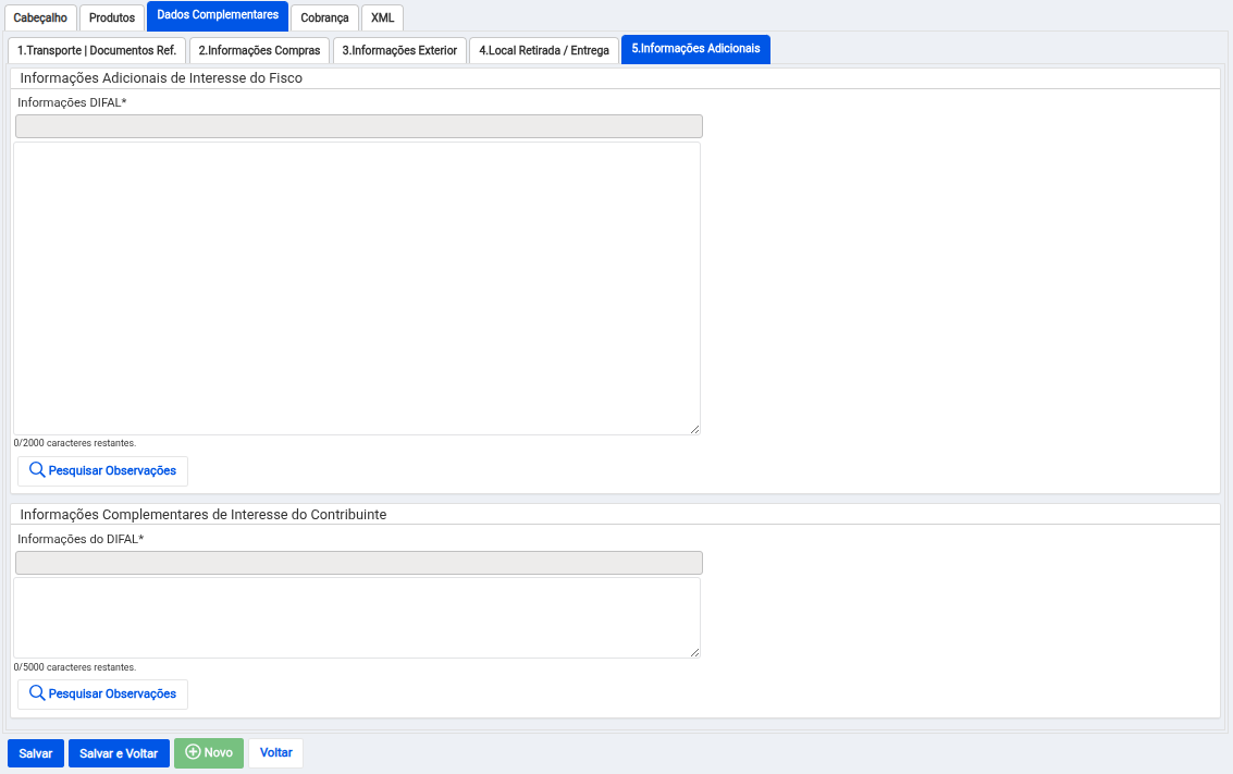 Ainda na aba Dados Complementares, acesse a aba 5. Informações Adicionais, é extremamente importante inserir informações sobre a saída de mercadoria. Através do botão Pesquisar Observações é possível inserir observações configuradas em Administrativo > Cadastros > Observações.