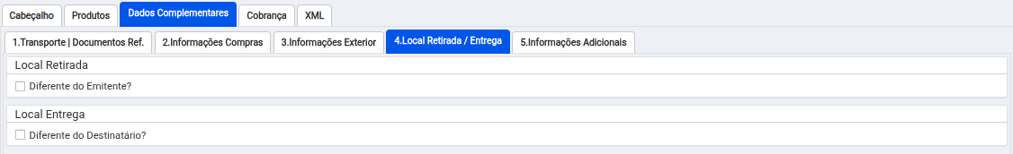 Ainda na aba Dados Complementares e na aba 4. Local Retirada / Entrega, é possível inserir informações do local de retirada e de entrega nos casos em que for diferente do que está sendo informado no endereço do emitente e destinatário.
