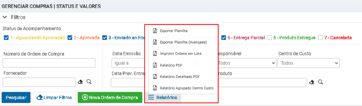 No item Filtros, é possível realizar a pesquisa de ordens de compra através dos status de acompanhamento. Existem as seguintes opções: