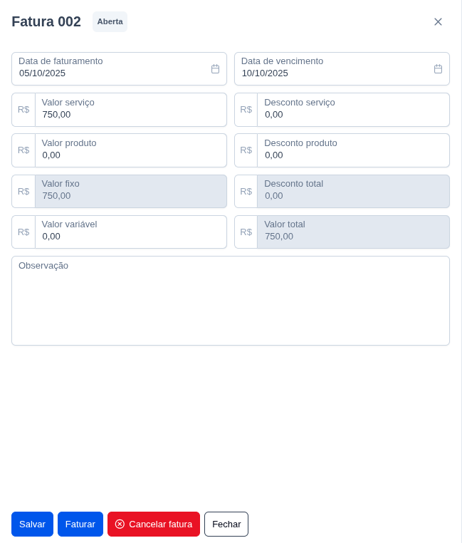 Quando tiver feito as alterações desejadas, clique em Faturar para que o sistema gere o recebimento no módulo Financeiro e a nota fiscal baseada no preenchimento dos dados do contrato.