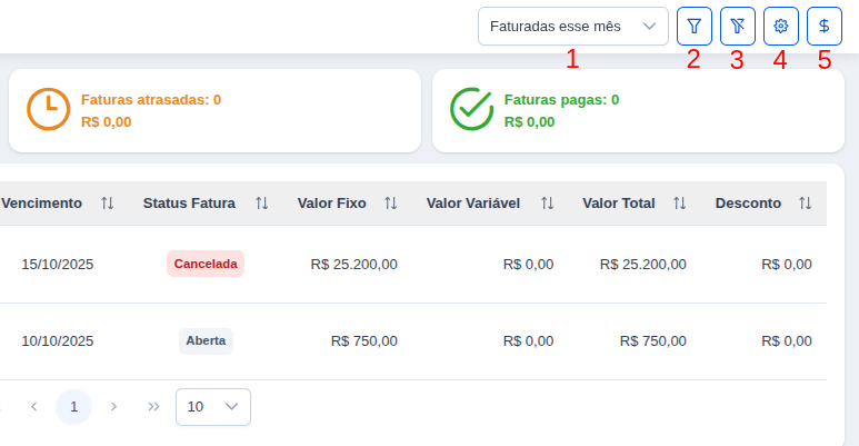 1 - Filtros prontos: esse campo apresenta uma lista com filtros já prontos para facilitar a pesquisa das faturas, eles incluem filtros como Faturadas esse mês, Vencimento esse mês e Todas as faturas.