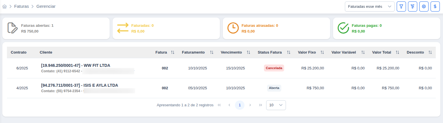 As faturas são controles periódicos de criação de recebimentos no módulo Financeiro e emissão de documentos fiscais a partir de contratos baseados na frequência definida dentro de cada contrato.
