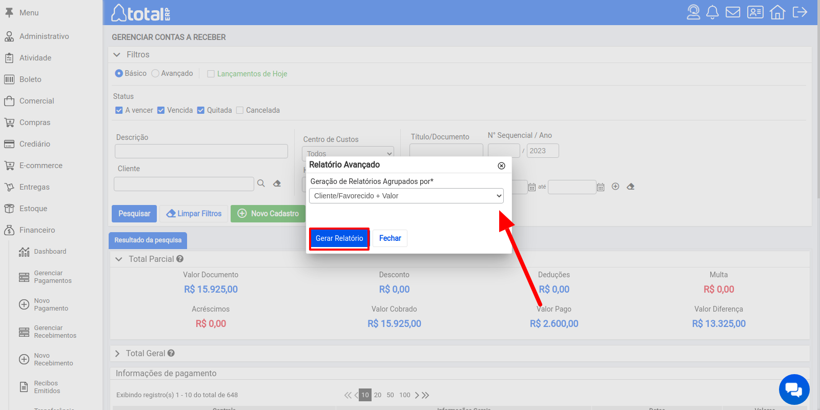 Para obter esse relatório acesse Financeiro > Gerenciar Pagamentos/Recebimentos, em seguida preencha os filtros de pesquisa como desejar e clique no botão pesquisar. Após isso você pode obter um relatório de sua pesquisa. Basta clicar em Relatórios > ...