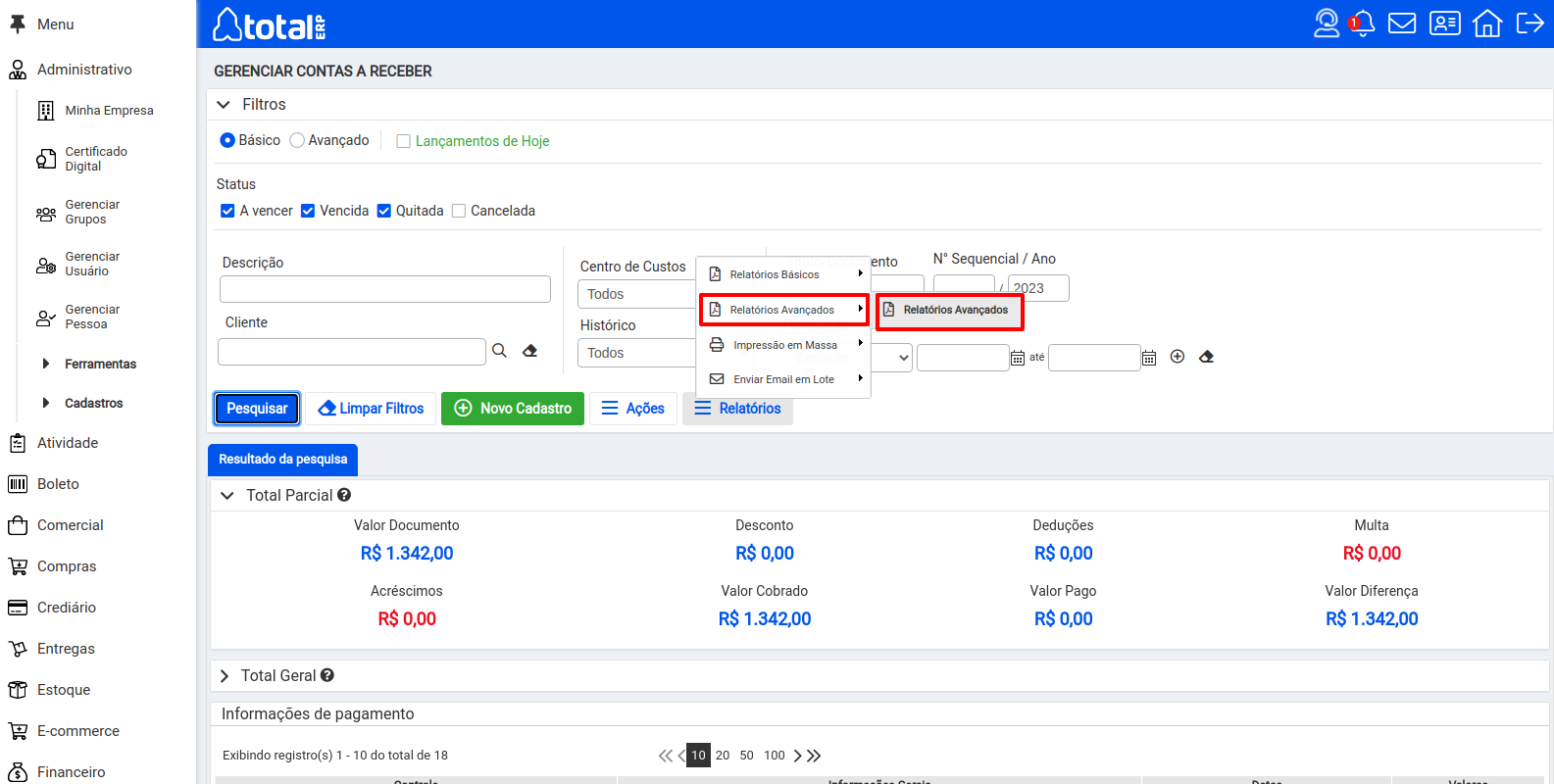 Para obter esse relatório acesse Financeiro > Gerenciar Pagamentos/Recebimentos, em seguida preencha os filtros de pesquisa como desejar e clique no botão pesquisar Em seguida você pode obter um relatório de sua pesquisa. Basta clicar em Relatórios > ...