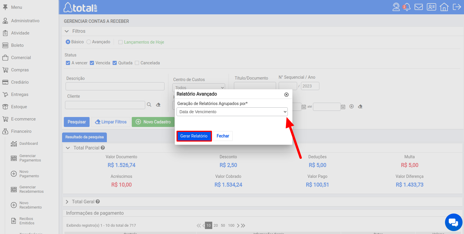 Após isso já é possível selecionar qual relatório agrupado deseja gerar, filtrando pela seta e logo após clicando em Gerar Relatório.