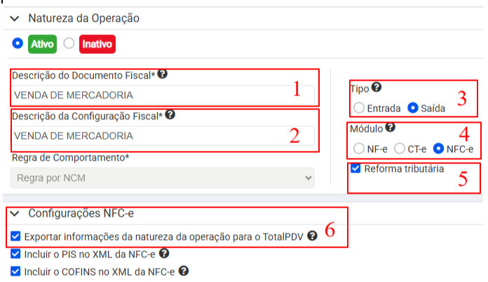 4 - o Módulo que em nosso exemplo NFC-e, porém se estiver cadastrando uma natureza da operação para outro documento fiscal, poderá selecionar outro módulo nesse campo.
